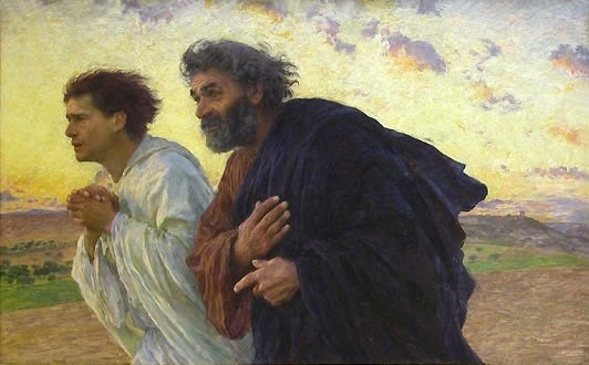 Pietro allora uscì insieme all’altro discepolo e si recarono al sepolcro. Correvano insieme tutti e due, ma l’altro discepolo corse più veloce di Pietro e giunse per primo al sepolcro. Si chinò, vide i teli posati là, ma non entrò.