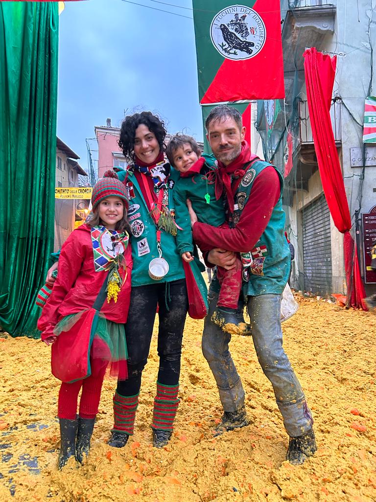 Sono stati proprio i genitori, appassionatisi fin da subito al Carnevale e alle sue tradizioni, a trasferire a Silvia l’amore per la Festa. “Anche se i miei genitori non sono nati qui, hanno fin da subito amato questa festa e appena era possibile invitavano i parenti dalla Puglia per far vivere anche loro queste emozioni. Casa mia era un vero porto di mare in quei giorni” ricorda oggi Silvia. E infatti il curriculum carnascialesco di Silvia è piuttosto importante: Abbà per due anni, nel 1991 e nel 1992 per la parrocchia di Sant’Ulderico, già sul Cocchio dell’eroina della Festa nel 1994 come damina della Mugnaia Miriam Meli, infine l’ingresso in Borghetto a 15 anni e quella passione viscerale mai nascosta per i colori rosso-verdi dei Tuchini. Dal 2024 è Corvo d’Oro, nonché fondatrice insieme ad alcune amiche del gruppo delle “Moleste”, immancabile presenza che da 10 anni accoglie i malcapitati sulla riva destra della Dora durante i giorni di battaglia e non solo. È inevitabile che proprio in Borghetto abbia conosciuto l’amore della sua vita, James Christian Hansen, anch’egli Corvo d’Oro e Tigre, oggi editor per Lonely Planet: nato a Forlì il 19 dicembre 1979 porta un nome e un cognome che non nascondono le origini americane (ma di discendenza danese) della parte paterna della sua famiglia. Il padre James Douglas, originario di Seattle, è stato vice console americano a Napoli, e proprio in terra partenopea incontra Marina Varriale, la mamma del Toniotto, anch’essa purtroppo venuta a mancare nel 2016.