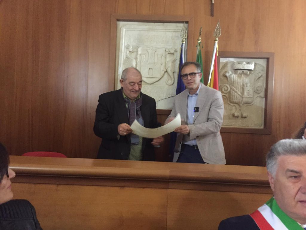 E’ toccato poi al presidente del consiglio comunale Gianfranco Ciriacono dare lettura della delibera della giunta prima di consegnare la prestigiosa e significativa pergamena che concede all’artista vercellese la cittadinanza onoraria di Acate tra gli applausi dei presenti.
