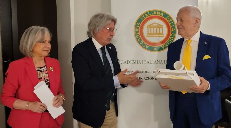 La delegata Paola Bernascone Cappi ha consegnato il kit, con la spilletta e la cravatta d’ordinanza, al neo accademico Tony Bisceglia.