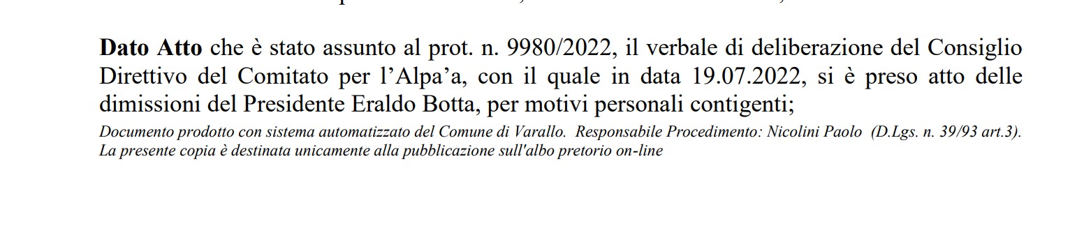 Per sapere di queste dimissioni “per motivi contingenti e personali” bisogna avere tempo e voglia di andare a spulciare un Atto del Comune di Varallo