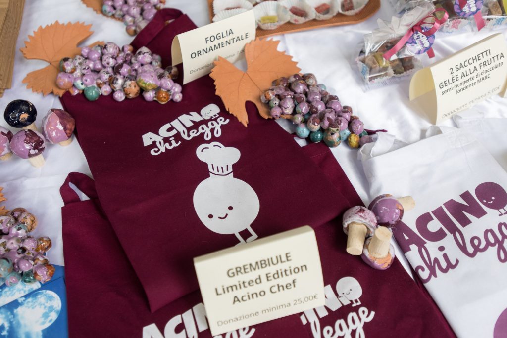 Novità di quest’anno è la collaborazione con l’artista Valeria Belloro che ha realizzato, per l’evento, una serie di oggetti regalo, in ceramica, dedicati al tema dell’uva e ispirati all’iconico acino che fa parte del logo di “Acino chi legge”.