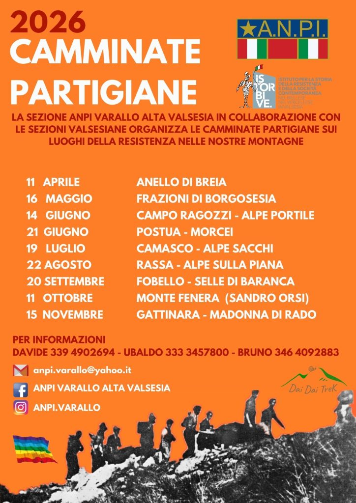 Quest’anno si festeggia l’80° della Repubblica e il voto alle donne e tornano le Camminate Partigiane organizzate dall’ ANPI Varallo Alta Valsesia, in collaborazione con l’Istituto per la storia della Resistenza e della società contemporanea nel Biellese, nel Vercellese e in Valsesia, e altre sezioni Valsesiane, per celebrare i luoghi della Resistenza sulle nostre montagne.