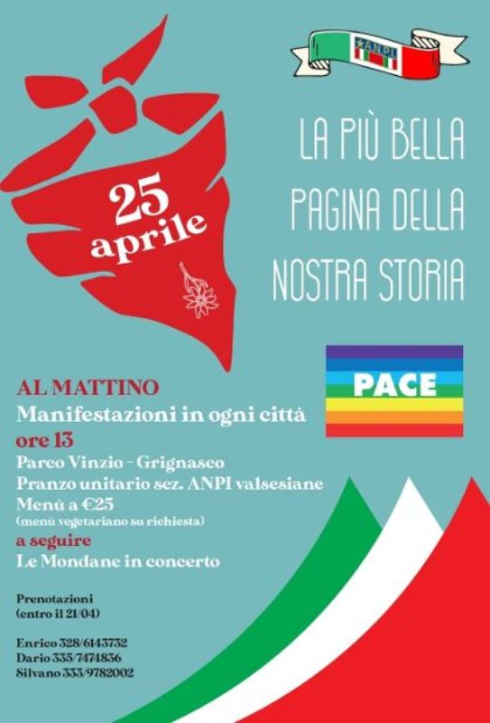 Alle ore 13.00 le Anpi Valsesiane organizzano il pranzo unitario al Parco Vinzio – Menu vegetariano su richiesta.