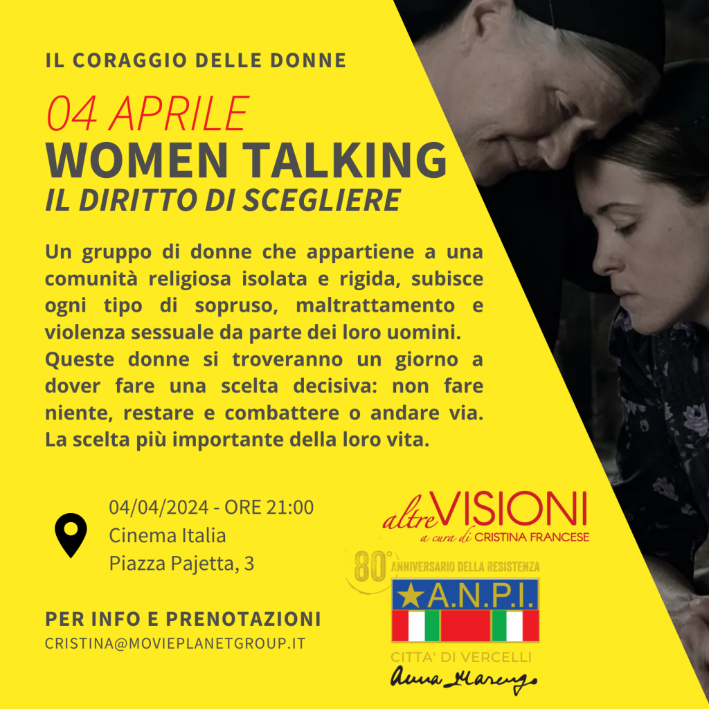 Si parte giovedì 4 aprile con la pellicola U.S.A. del 2022 “Women Talking – il diritto di scegliere”, tratto da un romanzo di Miriam Toews ed Oscar per la miglior sceneggiatura non originale nel 2023.