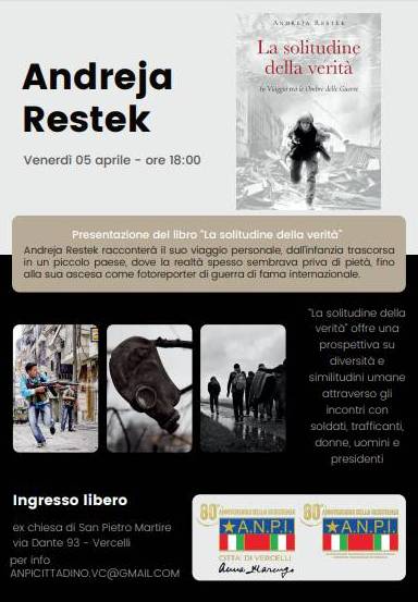 Venerdì 5 Aprile alle 18, nell’ex Chiesa di San Pietro Martire, con ingresso da Via Dante Alighieri n. 93, a cura dell’ANPI cittadina “Anna Marengo”, sarà presentato il libro della giornalista fotoreporter Andreja Restek “La solitudine della verità, in viaggio tra le ombre della guerra”.
