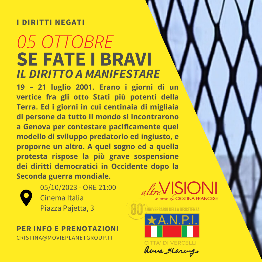 La sezione vercellese dell’ANPI “Anna Marengo” organizza, insieme con le locali Amnesty International, Emergency e CGIL, una cine rassegna dal titolo” I diritti negati”, in collaborazione con “Movie Planet”.