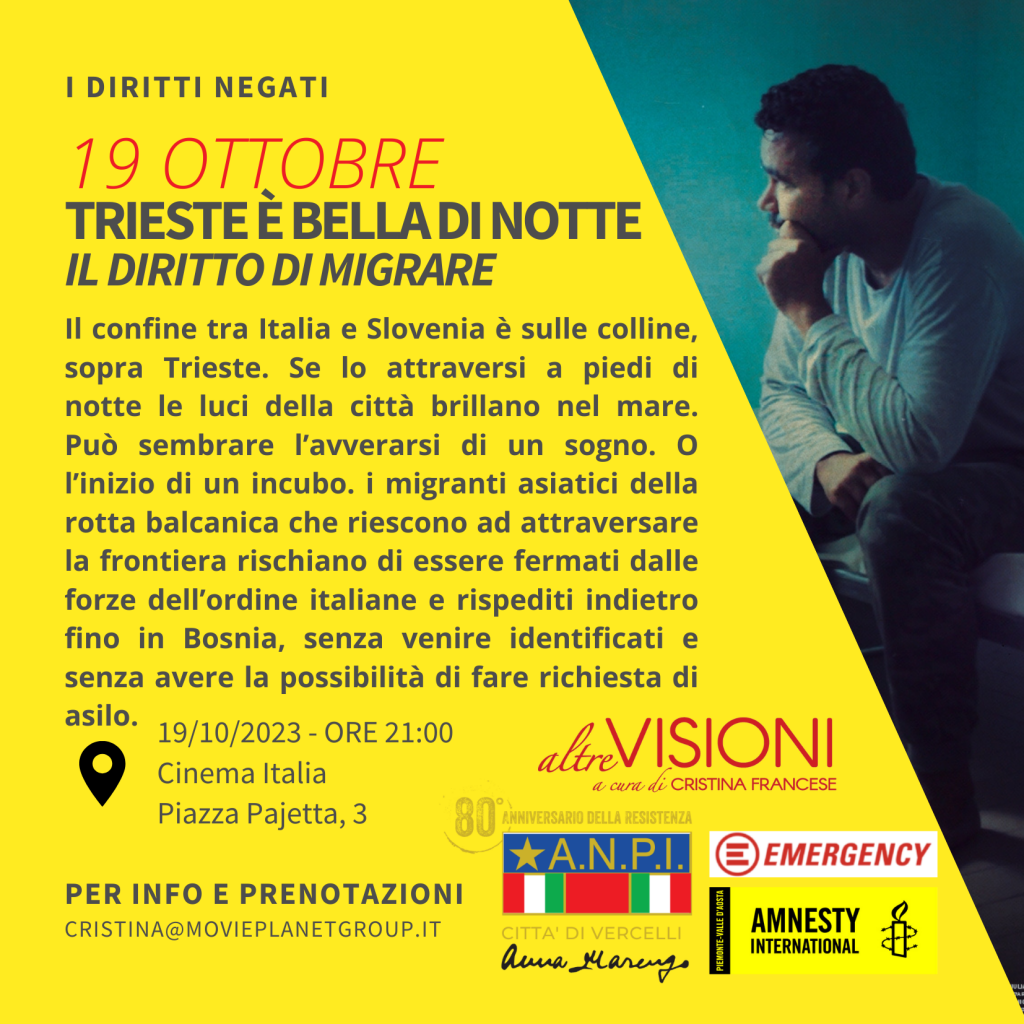 Infine, giovedì 19 ottobre, sempre alle 21, si assisterà al documentario “Trieste è bella di notte”, opera collettiva di Matteo Calore, Stefano Collizzoli e Andrea Segre; a introdurre la serata: Rosario Orlando di Amnesty e Federica Cena di Emergency.