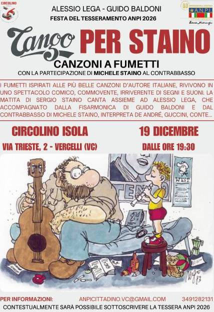La Sezione ANPI Città di Vercelli “Anna Marengo”, in collaborazione con il Circolino Isola, presenta “Tango per Staino – Canzoni a fumetti”, una serata dedicata al ricordo affettuoso e ironico di Sergio Staino, maestro della satira italiana e voce imprescindibile della nostra cultura civile.