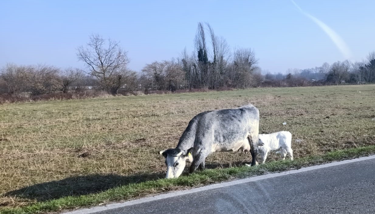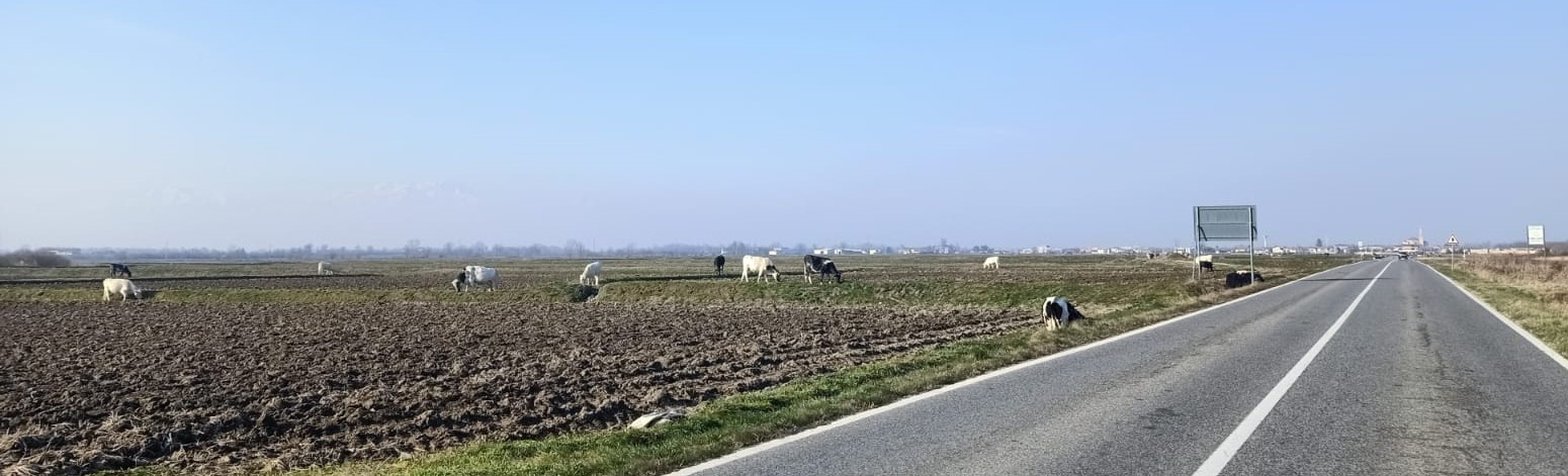 Ha evidentemente deciso di prendersi qualche ora di svago questa mandria di placide bovine (al seguito anche qualche vitellino) che si è diretta nei campi attigui alla Strada Statale 594, in territorio comunale di Arborio, in prossimità del magazzino di stoccaggio della Penny Market.