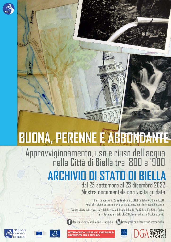 Verrà inaugurata domenica 25 settembre in occasione delle “Giornate Europee del Patrimonio (“European Heritage Days)”, la più estesa e partecipata manifestazione culturale d’Europa promossa dal Consiglio d’Europa e dalla Commissione Europea), una nuova mostra documentale dell’Archivio di Stato di Biella. L’esposizione, allestita presso la Sala Studio dell’Istituto, avrà come filo conduttore l’acqua.