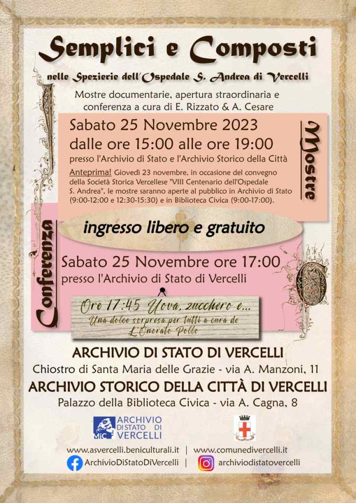 L’Archivio di Stato di Vercelli e l’Archivio Storico della Città di Vercelli rendono nuovamente omaggio alla ricorrenza degli 800 anni dalla fondazione dell’Ospedale di Sant’Andrea, con “Semplici e Composti: nelle Spezierie dell’Ospedale S. Andrea di Vercelli”.