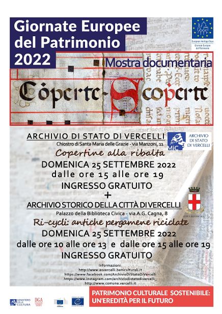 L’evento è organizzato in collaborazione con l’Archivio Storico della città di Vercelli, che svilupperà il medesimo tema con una iniziativa dal titolo “Ri-cycli: antiche pergamene riciclate”, che si svolgerà domenica 25 settembre presso il palazzo della Biblioteca Civica in via A.G. Cagna, 8 dalle ore 10 alle 13 e dalle ore 15 alle ore 19, sempre ad ingresso libero e gratuito.