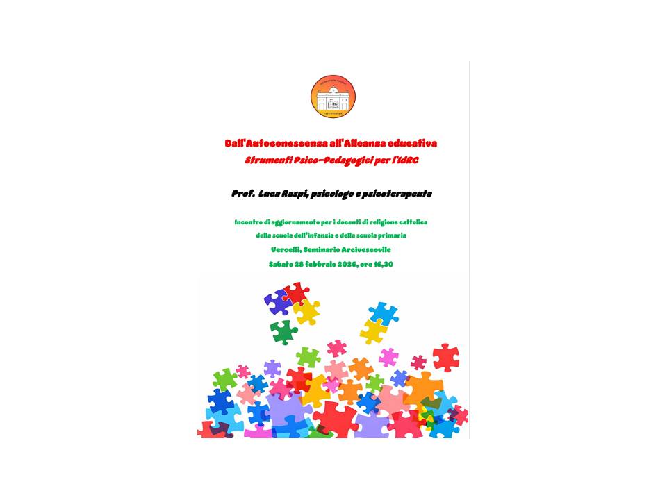 L’Ufficio Scuola dell’arcidiocesi di Vercelli organizza per sabato 28 febbraio, dalle ore 16,30, presso il Seminario arcivescovile, un incontro di aggiornamento dal titolo “Dall’Autoconoscenza all’Alleanza educativa. Strumenti Psico-Pedagogici per l’IdRC” rivolto agli insegnanti di religione cattolica della scuola dell’infanzia e della scuola primaria.