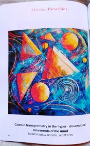 L’opera selezionata e pubblicata di Paracchini è stata realizzata nel 2018 ed è intitolata “Cosmic Transgeometry in the Hyper-Dimensional Movements of the Mind” e rappresenta la fase di ricerca artistica dedicata all’ astrattismo geo-cosmico e alla transgeometria cioè una visione cosmica attraversata “dagli infiniti movimenti ondulatori curvilinei dell’anima e della mente che si intersecano con il movimento vorticoso circolare dell’Universo secondo una geometria iperellittica, dando origine ad un dinamismo cosmico assoluto, che amplia la prospettiva e apre una porta verso l’Infinito, attraversato da flussi vibranti di energia cromatica iperdimensionale in Free Sprinkling Overflowing e Sparkling, capaci di trasfigurare la realtà e trasformarla in puro canto universale”.