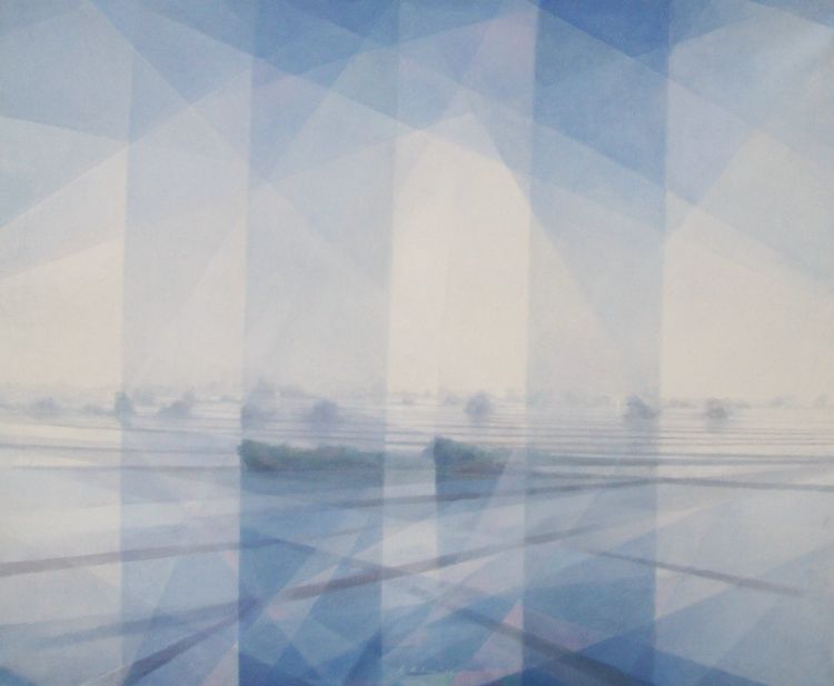 “Si tratta di un’opera a cui sono particolarmente affezionato e che si ricollega molto bene al tema della mostra; la tavolozza è evanescente e sognante, i rosa diventano azzurri che diventano grigi quasi senza soluzione di continuità generando atmosfere brumose da cui emergono isolati elementi pittorici. Avvolto nel manto protettivo della foschia, ritorna prepotente il motivo antico della solitudine, quella solitudine amata e odiata da ogni artista, una solitudine che angoscia forse, ma in qualche caso sa anche esaltare, che conduce un animo sensibile alla scoperta della verità, in un viaggio dentro se stessi alla ricerca di radici e identità, ma anche, e soprattutto, metafora della vita alla ricerca di nuove emozioni, di libertà di esprimersi, di pace interiore e per questo ho pensato di offrire ai vercellesi una rassegna di opere che rappresentano il pecorso artistico che mi ha portato alla Biennale di Venezia”.
