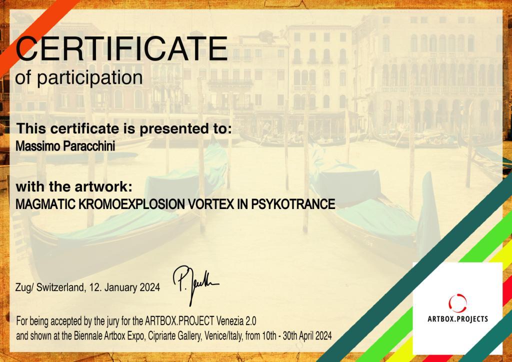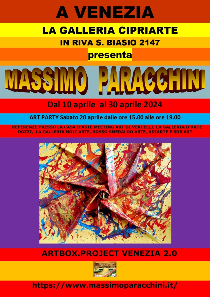Massimo Paracchini avrà in video esposizione un’opera intitolata “Magmatic Kromoexplosion Vortex in Psykotrance” a Venezia nella prestigiosa e incantevole Galleria Cipriarte, in Riva S. Biasio, 2147, tra la pulsante Piazza San Marco e l’ampia area dell’Arsenale della Biennale dal 10 al 30 aprile 2024 proprio durante la Biennale Arte 2024.