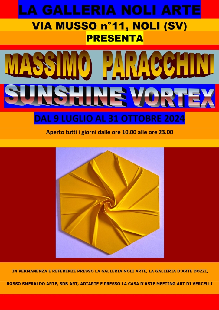Massimo Paracchini sarà in esposizione presso la Galleria Noli Arte a Noli in provincia di Savona con una nuova mostra intitolata “Sunshine Vortex” ovvero “vortice di luce solare” dal 9 luglio al 31 ottobre 2024, visitabile tutti i giorni dalle ore 10.00 alle ore 23.00.