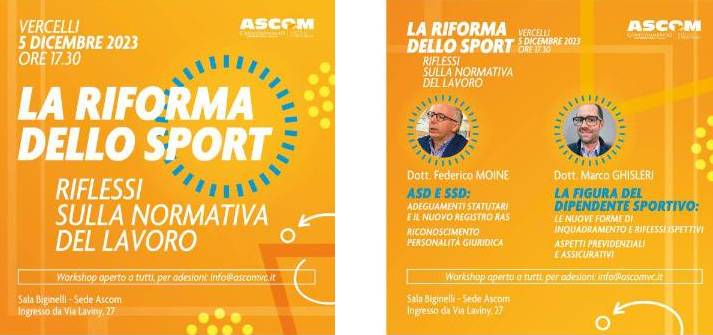 Martedì 5 dicembre alle 17.30, presso la sala Biginelli della sede Ascom di Vercelli (con ingresso da via Laviny, 27) si terrà il workshop “La Riforma dello Sport – Riflessi sulla normativa del lavoro”.