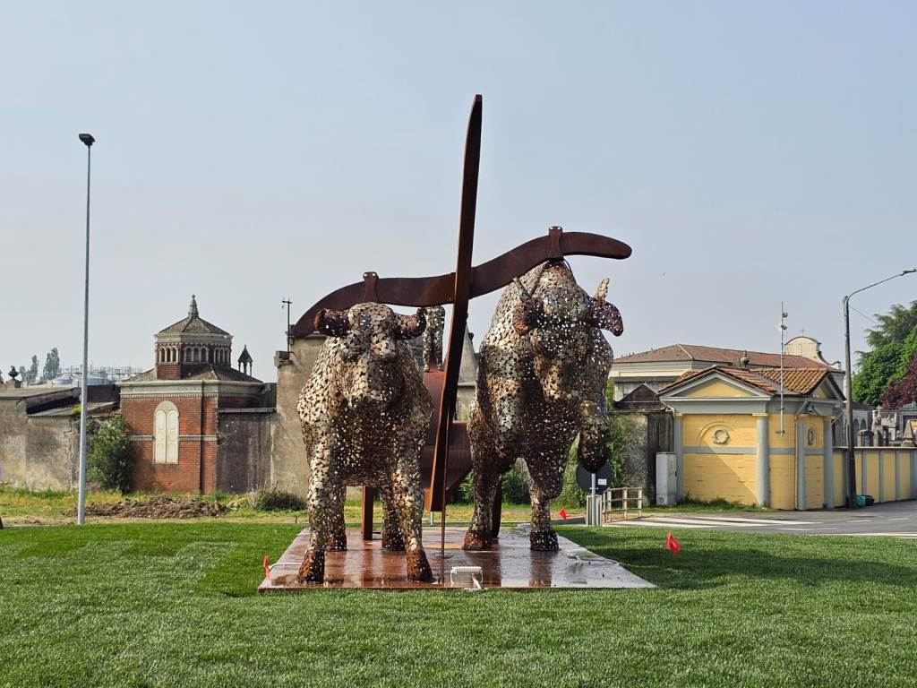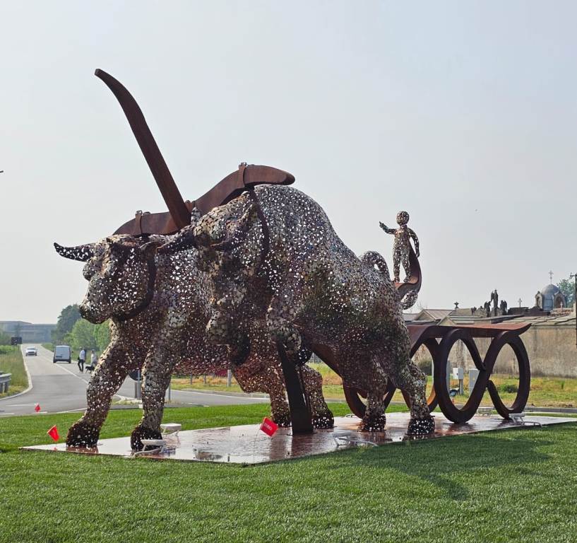 La scultura, un suggestivo intrico di metallo dalle sfumature ramate e brune, raffigura con straordinario dinamismo due possenti buoi in piena corsa, intenti a trainare un piccolo carro le cui ruote richiamano il simbolo dell’infinito.