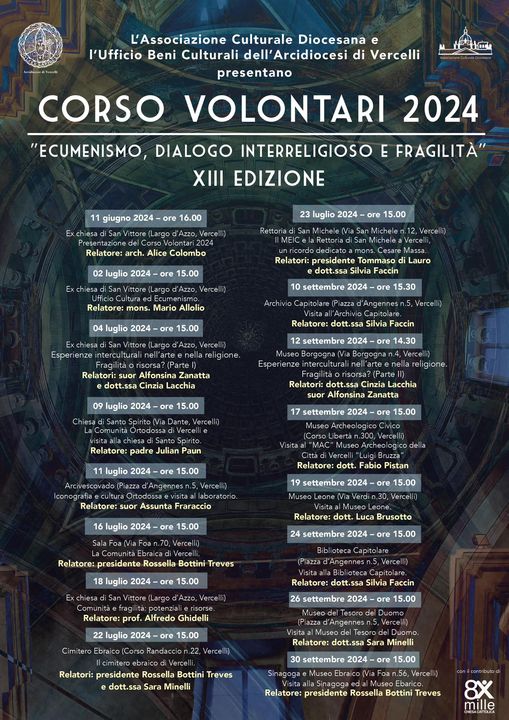 Il tema del 2024 è Ecumenismo, dialogo interreligioso e fragilità, vero e proprio cappello di una rassegna di eventi che non solo è dedicata ai volontari, ma anche a coloro che vogliano avvicinarsi alle attività dell’Associazione. Sedici incontri, aperti a tutti e gratuiti, per continuare dialoghi interreligiosi ed ecumenici mirati ad esplorare la comunità e le sue fragilità, per dare, attraverso la cultura e le voci del territorio, un supporto fattivo al miglioramento dell’accessibilità non solo fisica ma anche percettiva e sensoriale.