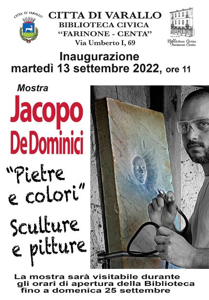 Jacopo De Dominici, varallese, restauratore ed artista dell’anima, che non ama apparire e ha fatto della gentilezza e della discrezione le sue cifre esistenziali, martedì 13 settembre alle ore 11, inaugurerà la sua nuova mostra personale: “Pietre e colori” Sculture e pitture, che sarà visitabile fino a domenica 25 settembre negli orari di apertura della Biblioteca.
