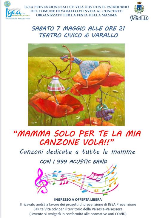 L’Associazione Igea, con il patrocinio del Comune di Varallo, in occasione della Festa della mamma, organizza sabato 7 maggio alle ore 21.00 presso il Teatro Civico di Varallo, il concerto “Mamma solo per te la mia canzone vola”, canzoni dedicate a tutte le mamme con i 999 Acust Band.