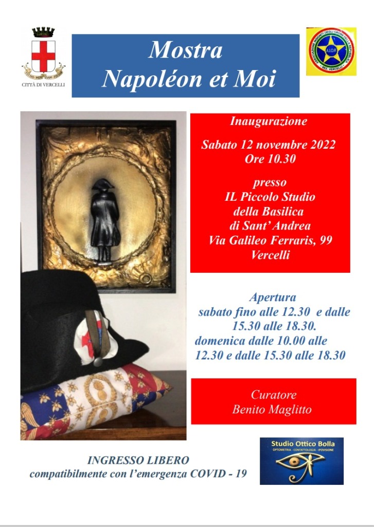 Nei locali del piccolo studio della Basilica di Sant’Andrea in via Galileo Ferraris in Vercelli, nei giorni di sabato e domenica 12 e 13 novembre verrà organizzata, a cura dell’Associazione Insigniti agli Ordini della Repubblica (A.I.O.R) con il Patrocinio del Comune di Vercelli, una mostra intitolata “Napoléon et Moi”.
