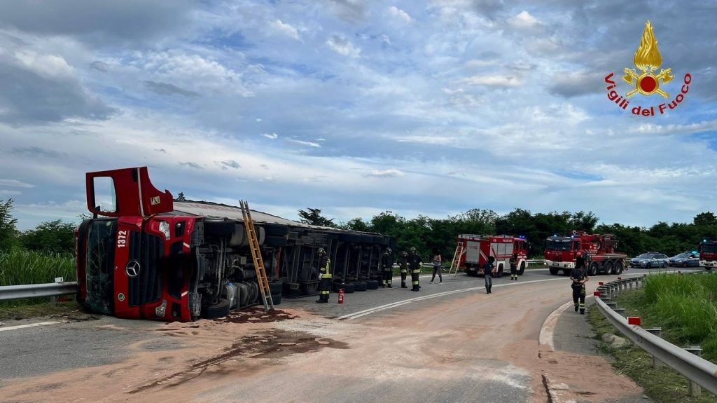 Nel sinistro è rimasto coinvolto un autoarticolato trasportante bancali di cellulosa che si è ribaltato.