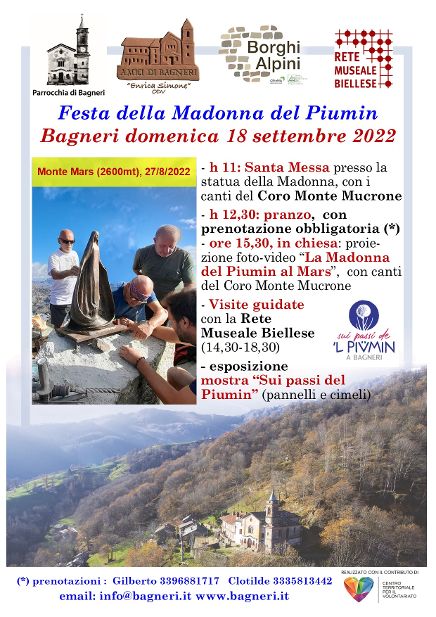 Ora che la statuetta, di piccole dimensioni, della Madonna del Piumin è sulla vetta del Monte Mars, dove è stata portata a fine agosto, c’è un motivo in più per festeggiare e una nuova avventura da raccontare e l’occasione è l’annuale festa della Madonna del Piumin in programma a Bagneri domenica 18 settembre. L’appuntamento è a Bagneri per le 11 presso la statua della Madonna del Piumin, dove sarà celebrata la Santa Messa, con i canti del Coro Monte Mucrone; poi aperitivo per tutti e pranzo organizzato dall’associazione Amici di Bagneri ODV.
