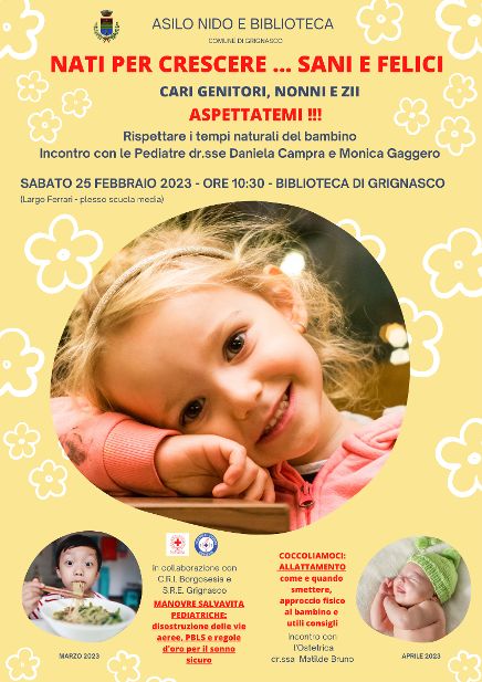 Prenderà il via, sabato 25 febbraio alle ore 10:30 presso la Biblioteca di Grignasco, il nuovo ciclo di incontri “Nati per crescere… sani e felici” ideato dal Comune (Assessorato alla Cultura) e posto in essere, in collaborazione, dalla Biblioteca e dall’Asilo Nido, alleati naturali nell’aiutare  le famiglie nel loro difficile ruolo.