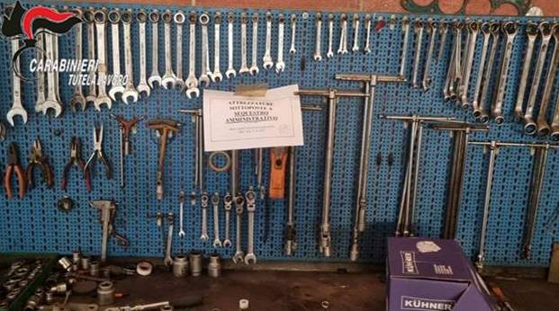 L’attività esercitava irregolarmente anche la professione di meccatronica e gommista pur essendo autorizzata esclusivamente per l’attività di carrozzeria. È stata elevata una sanzione amministrativa ai sensi dell’art. 10 comma 3 della Legge 05.02.1992 n. 122 per un importo di €2.582,00 ed è stato disposto il sequestro amministrativo cautelare delle attrezzature utilizzate per le attività non autorizzate, finalizzato alla confisca.