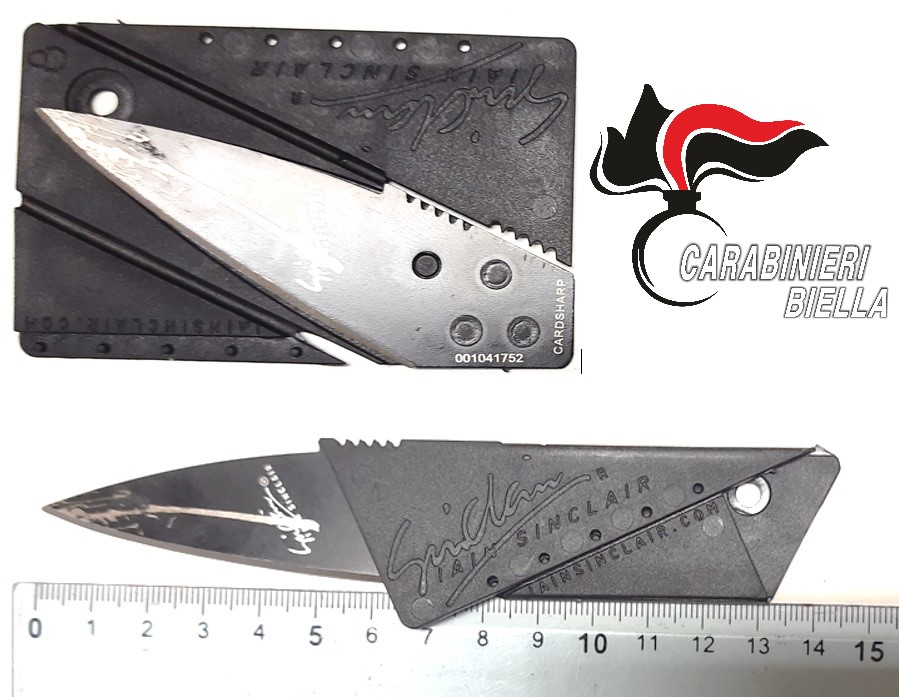 I militari, immediatamente intervenuti, hanno sequestrato il particolare coltello ultrasottile “Lain Sinclair a Carta di Credito” avente lama della lunghezza di cm 6 (sei), che veniva consegnato dal denunciato.