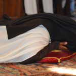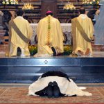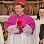 Sr. Agata si inginocchia di fronte al Vescovo, il quale pronuncia la preghiera di benedizione.