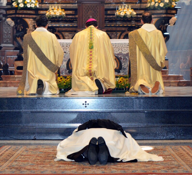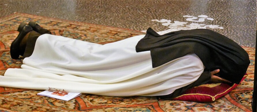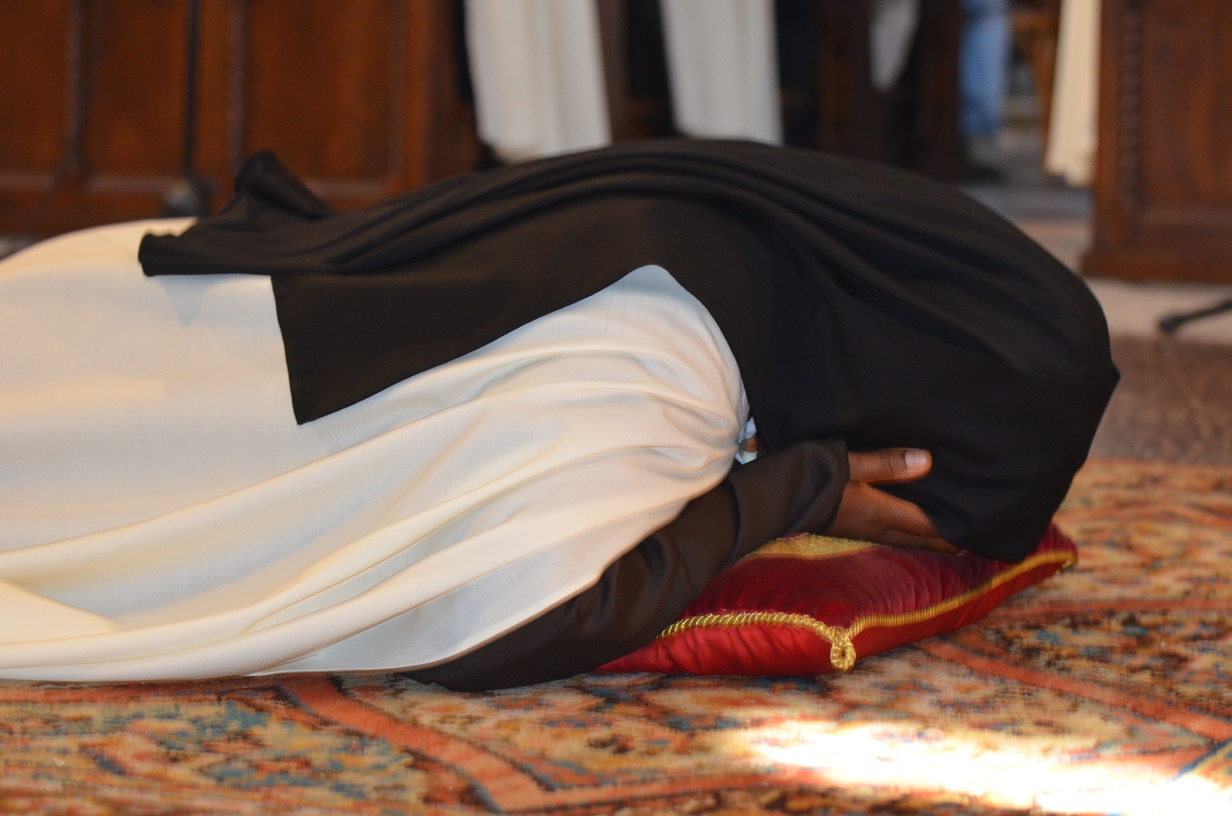 Sr. Agata si inginocchia di fronte al Vescovo, il quale pronuncia la preghiera di benedizione.