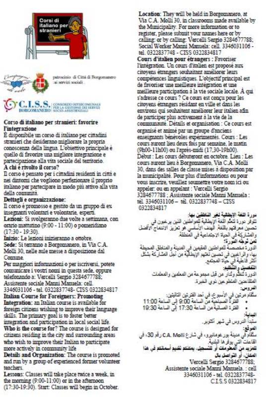 È disponibile un corso di italiano per cittadini stranieri che desiderano migliorare la propria conoscenza della lingua promosso dall’associazione Compagni di volo e patrocinato dal Comune di Borgomanero.