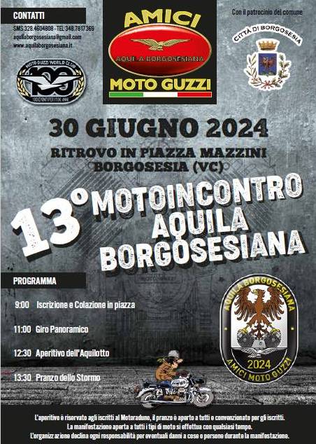 Appuntamento domenica 30 giugno 2024 in Piazza Mazzini a Borgosesia per il 13° Motoincontro Aquila Borgosesiana.