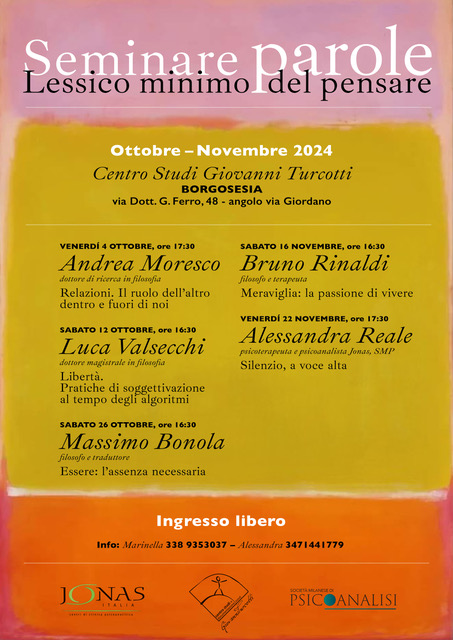 21/09/202421/09/2024 Valsesia e Valsessera BORGOSESIA - Al Centro Studi Turcotti incontri sul tema “Seminare parole. Lessico minimo del pensare” Un ciclo di cinque incontri dedicati a cinque parole essenziali: Relazioni, Libertà, Essere, Meraviglia e Silenzio