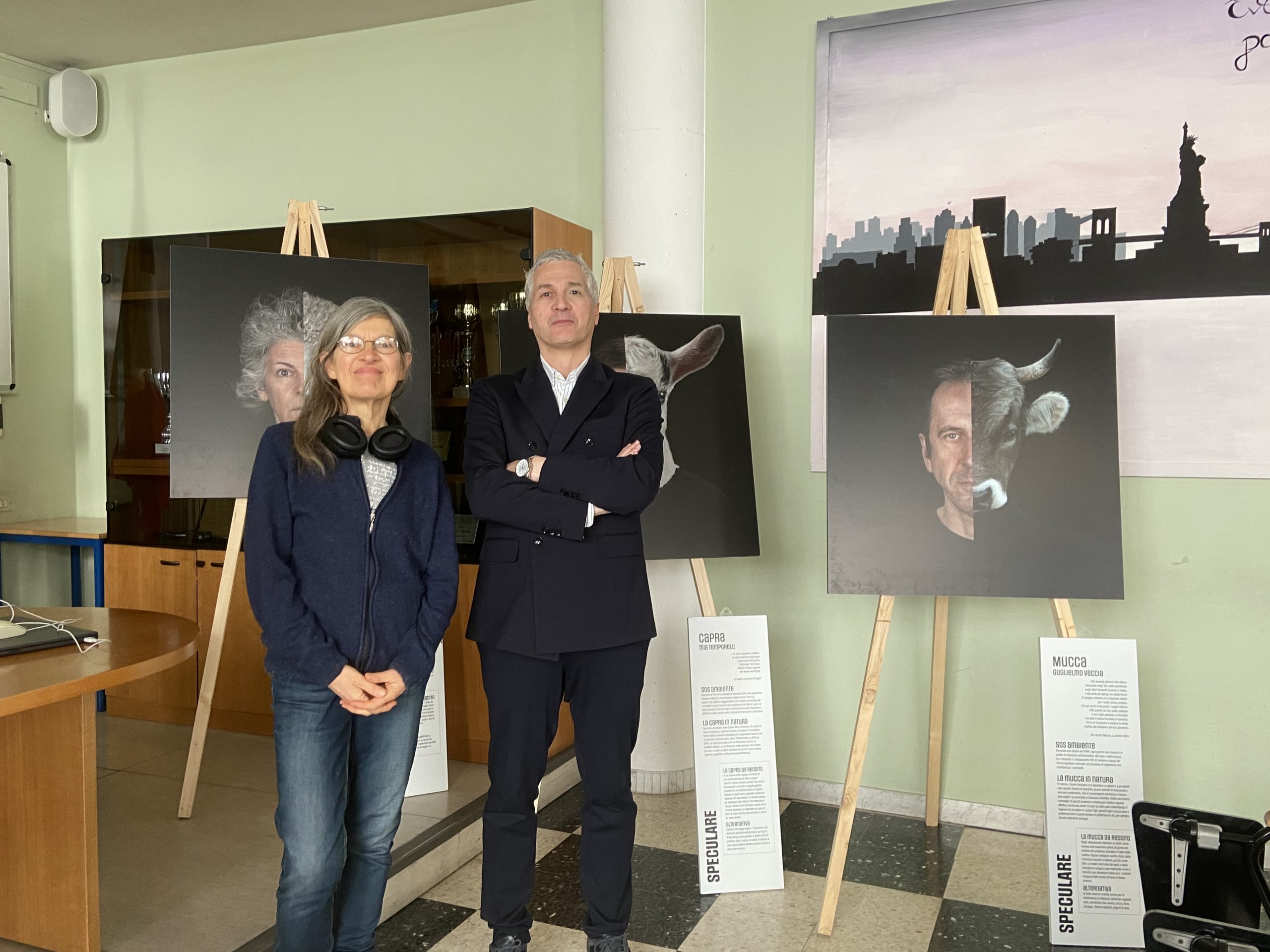 E dopo un confronto in proposito con il suo ex allievo Alessandro Tomiello, fotografo, è nata l’idea di abbinare visi umani e foto di persone in carne ed ossa a quelle degli animali, di qualunque specie, per dare un volto a ciò di cui ci nutriamo, per concentrarsi poi sul tema degli allevamenti intensivi, dell’ambiente e dell’essere umano in generale.