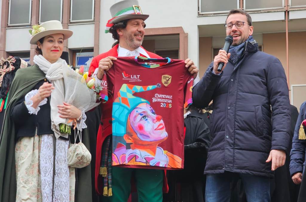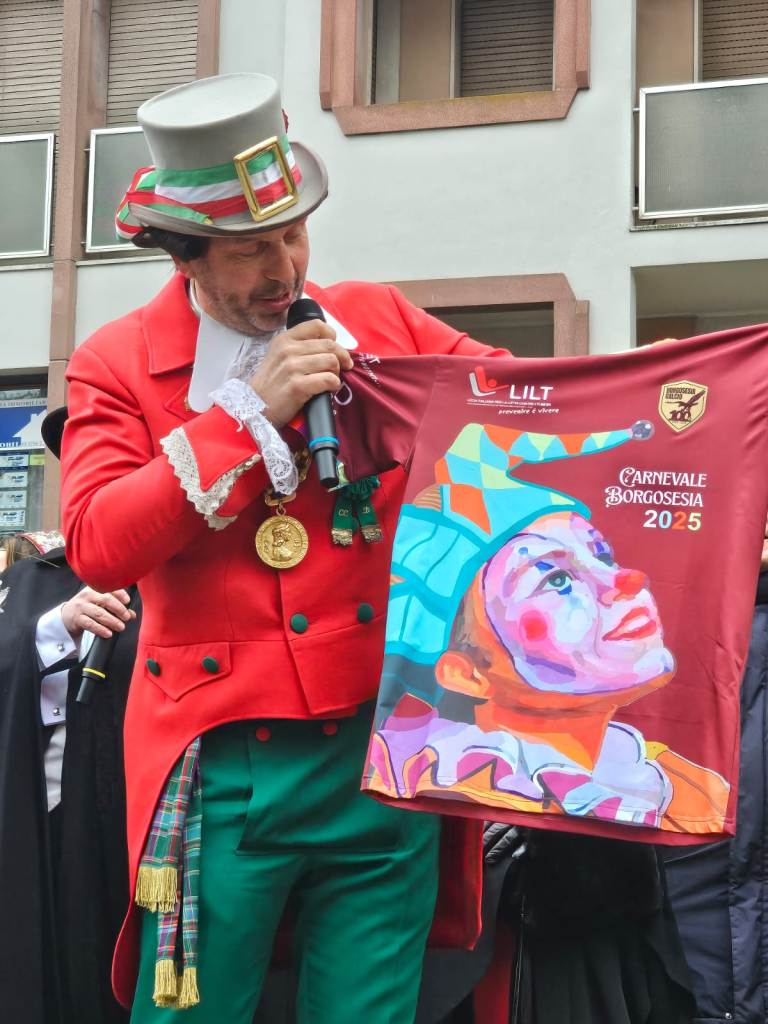 Sul palco, le maschere hanno presentato la maglia speciale celebrativa del Borgosesia Calcio, disegnata per l’occasione. Questa divisa, che verrà indossata durante i match casalinghi, sarà successivamente messa all’asta, con il ricavato destinato alla LILT.