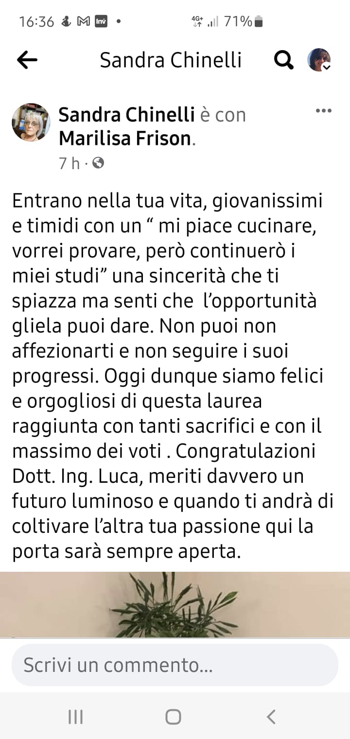 Dunque, in bocca al lupo, Ing. Luca, e tante sincere e sentite congratulazioni ai genitori Gianni e Marilisa: nella certezza che la Madonna continuerà a vegliare sul futuro del loro così meritevole figlio, lungo le strade della vita.