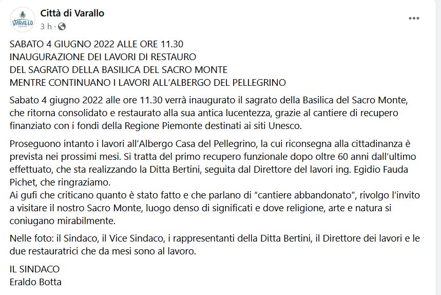 Diciamo che, sulla pagina ufficiale del Comune, uno si aspetterebbe (soprattutto essendo presente il Direttore dei Lavori Ing. Egidio Fauda Pichet e un Architetto rinomato come Pietro Bondetti) che un Pubblico Amministratore dicesse (ad esempio, non desideriamo certo insegnare il mestiere ad alcuno) cose aventi senso da un punto di vista amministrativo e contrattuale.