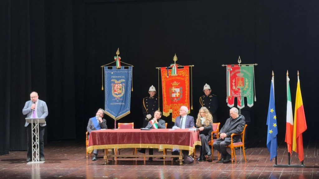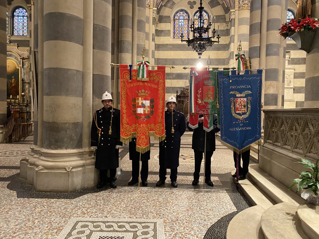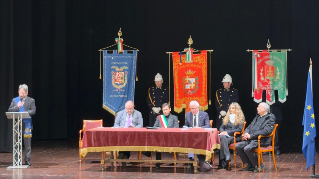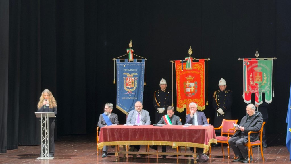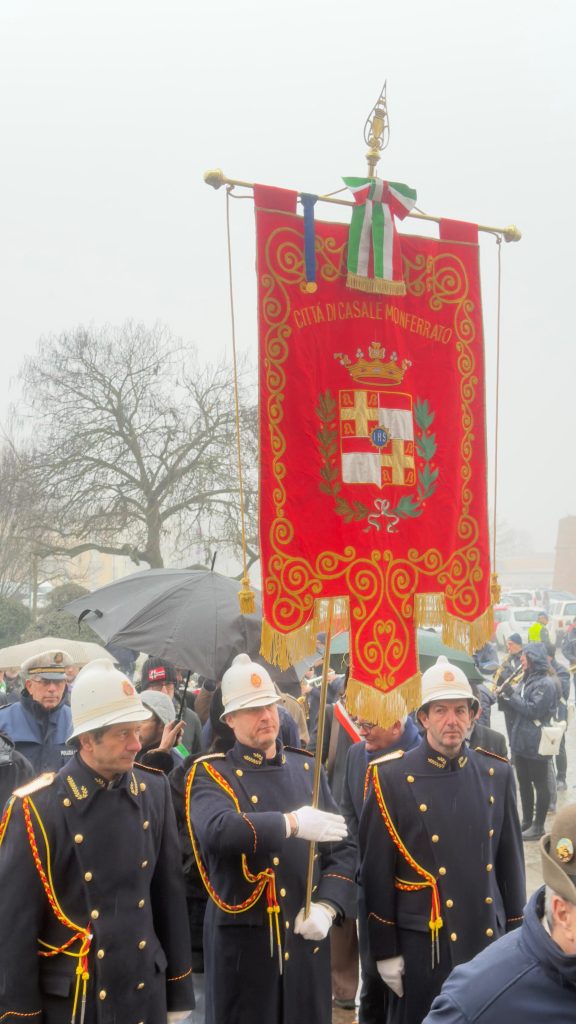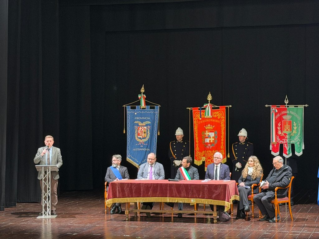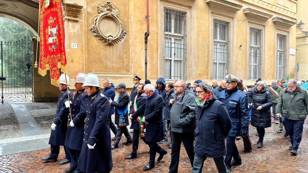Dopo la Santa Messa di Suffragio celebrata nella Cattedrale di Sant’Evasio il corteo accompagnato dalla Banda “La Filarmonica” di Occimiano ha raggiunto il Teatro Municipale per l’intervento del Sindaco di Casale Monferrato Emanuele Capra, seguito da quello di Carla Gagliardini a nome dell’Associazione Nazionale Partigiani d’Italia, Sezione di Casale Monferrato.