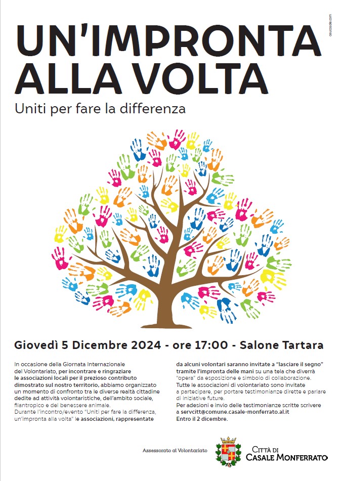 In occasione della Giornata Internazionale del Volontariato, giovedì 5 dicembre 2024 dalle ore 17,00 presso il Salone Tartara in Piazza Castello, si terrà l’evento dal titolo “Un’impronta alla volta. Uniti per fare la differenza”.