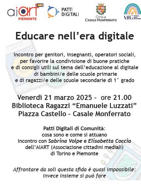 Venerdì 21 marzo alle ore 21,00 presso la Biblioteca delle ragazze e dei ragazzi “Emanuele Luzzati” di Casale Monferrato, si terrà “Educare nell’era digitale”, incontro con Sabrina Volpe ed Elisabetta Coccia, dell’Associazione Cittadini Mediali (AIART) di Torino per genitori, insegnanti, operatori sociali, per favorire la condivisione di buone pratiche e di consigli utili sul tema dell’educazione al digitale di bambini delle scuole primarie e di ragazzi delle scuole secondarie di primo grado.