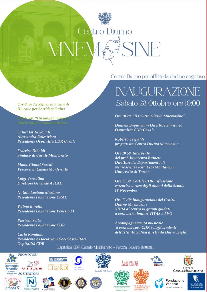 Si terrà oggi, sabato 28 ottobre alle ore 10,00 nella Sala Giumelli presso Ospitalità CDR (piazza C. Battisti,1 Casale Monferrato) l’inaugurazione di apertura del Centro Diurno “Mnemosine”.