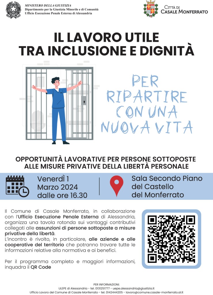 Venerdì 1 marzo 2024 alle ore 16,30 nella Sala al Secondo Piano del Castello del Monferrato si terrà l’incontro “Il lavoro utile tra inclusione e dignità. Opportunità lavorative per persone sottoposte alle misure privative della libertà personale”: tavola rotonda rivolta alle istituzioni e alle aziende che intende divulgare le informazioni sui vantaggi collegati alla normativa vigente e ai suoi benefici, quali la Legge n. 193 del 2000, cosiddetta Legge Smuraglia e successive integrazioni.
