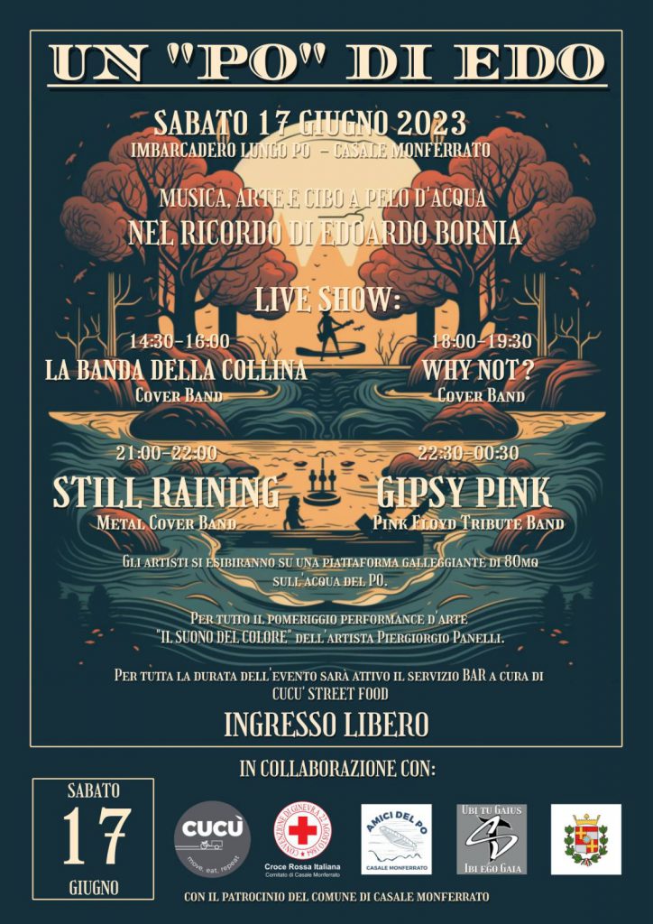 All’organizzazione c’è la neonata associazione Ubi tu Gaius, ibi ego Gaia (costituita proprio per perpetrare il ricordo di Edoardo Bornia supportando la passione musicale dei giovani monferrini), in collaborazione con gli Amici del Po, la Croce Rossa di Casale e il patrocinio del Comune di Casale.