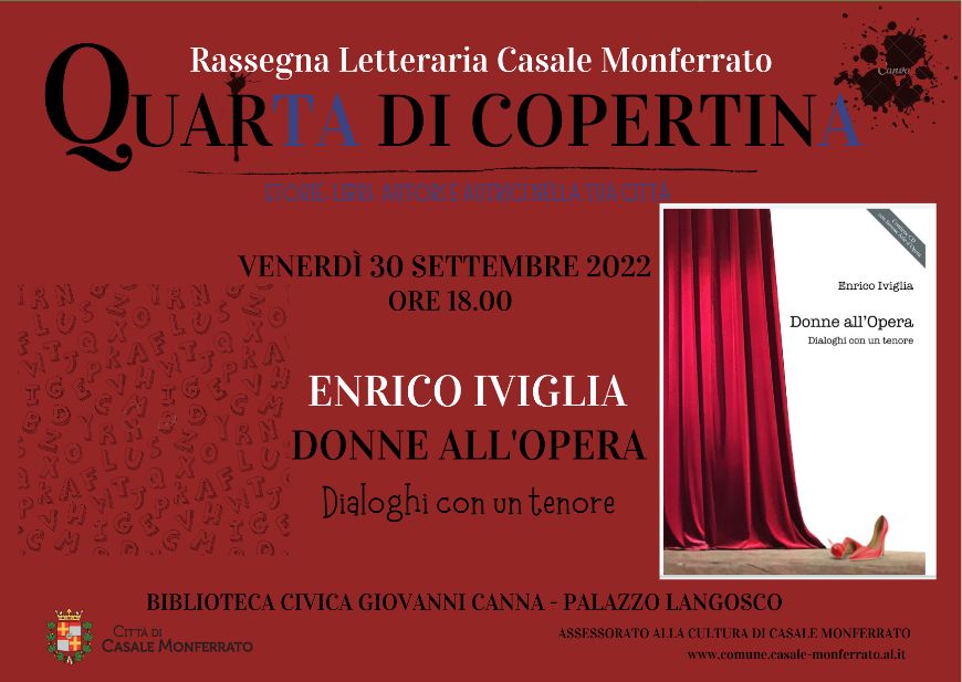 L’appuntamento è per le ore 18,00 nelle sale della Biblioteca Civica, in via Corte d’Appello, 12, con Enrico Iviglia che presenterà il suo libro Donne all’opera – Dialoghi con un tenore, edito da Team Service Editore.