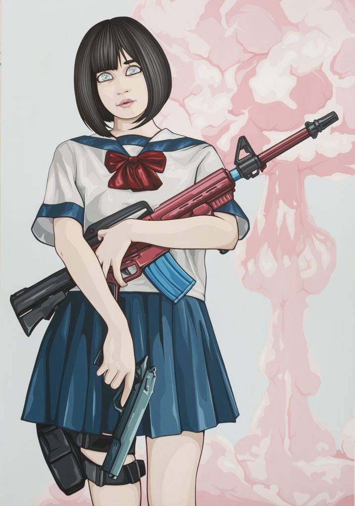 Dalla fascinazione per l’opera di Murakami che gli regala una nuova e decisiva visione pittorica, “iniziandolo” a quella che negli anni si affermerà come percorso artistico, alle suggestioni nipponiche di un universo basato su una cultura dell’effimero mediato però da uno sguardo occidentale, nutrendosi dalla riemersione di quella cultura televisiva e fumettistica (anime) anni 80 decisamente pop.